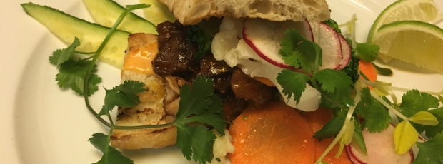 Warm braised meat with braising liquid in sauté pan, meanwhile spread brad with mayo as desired and place meat on bottom, topping with sliced cucumber, jalapeño slices and pickled vegetables as desired.